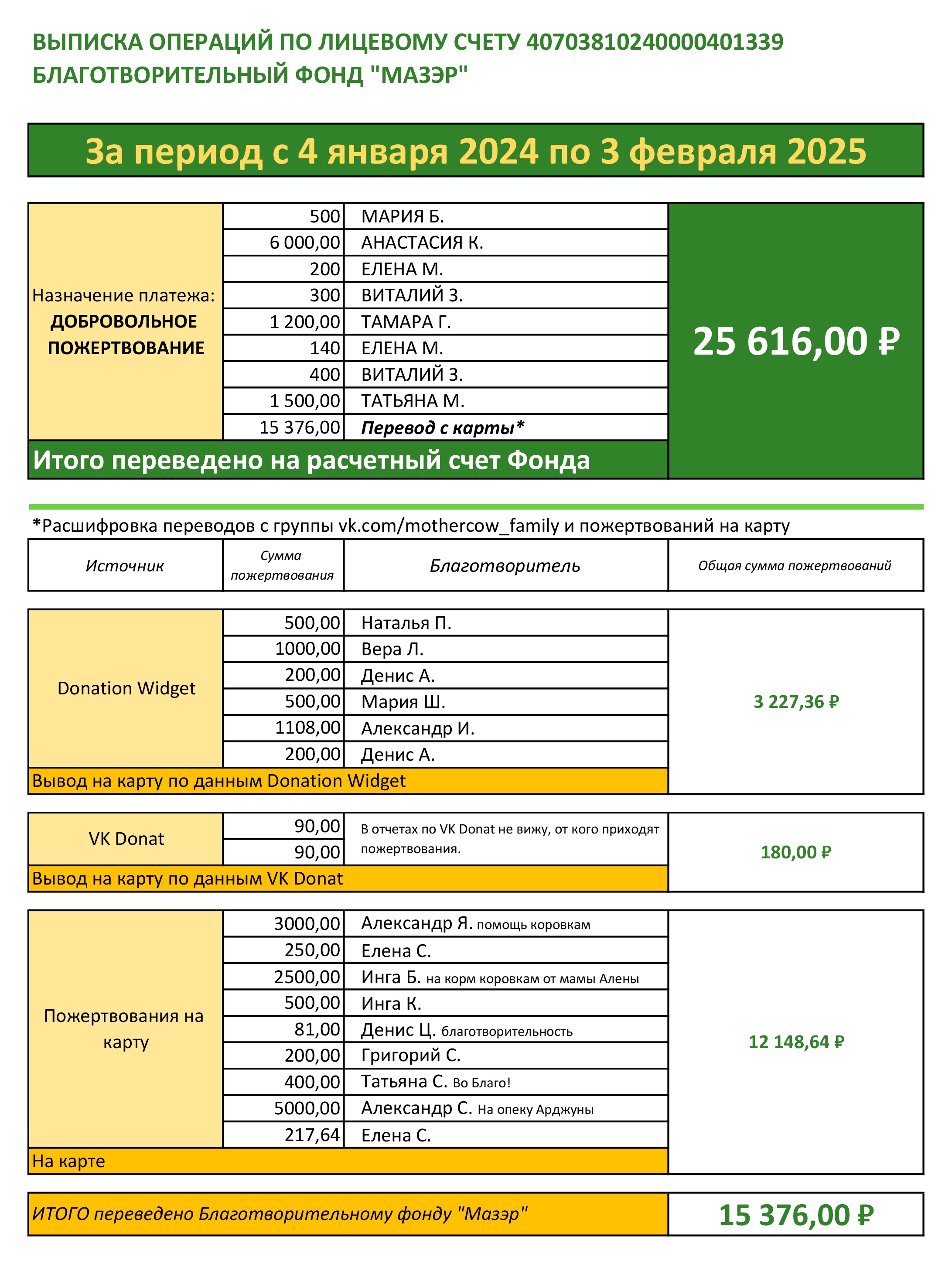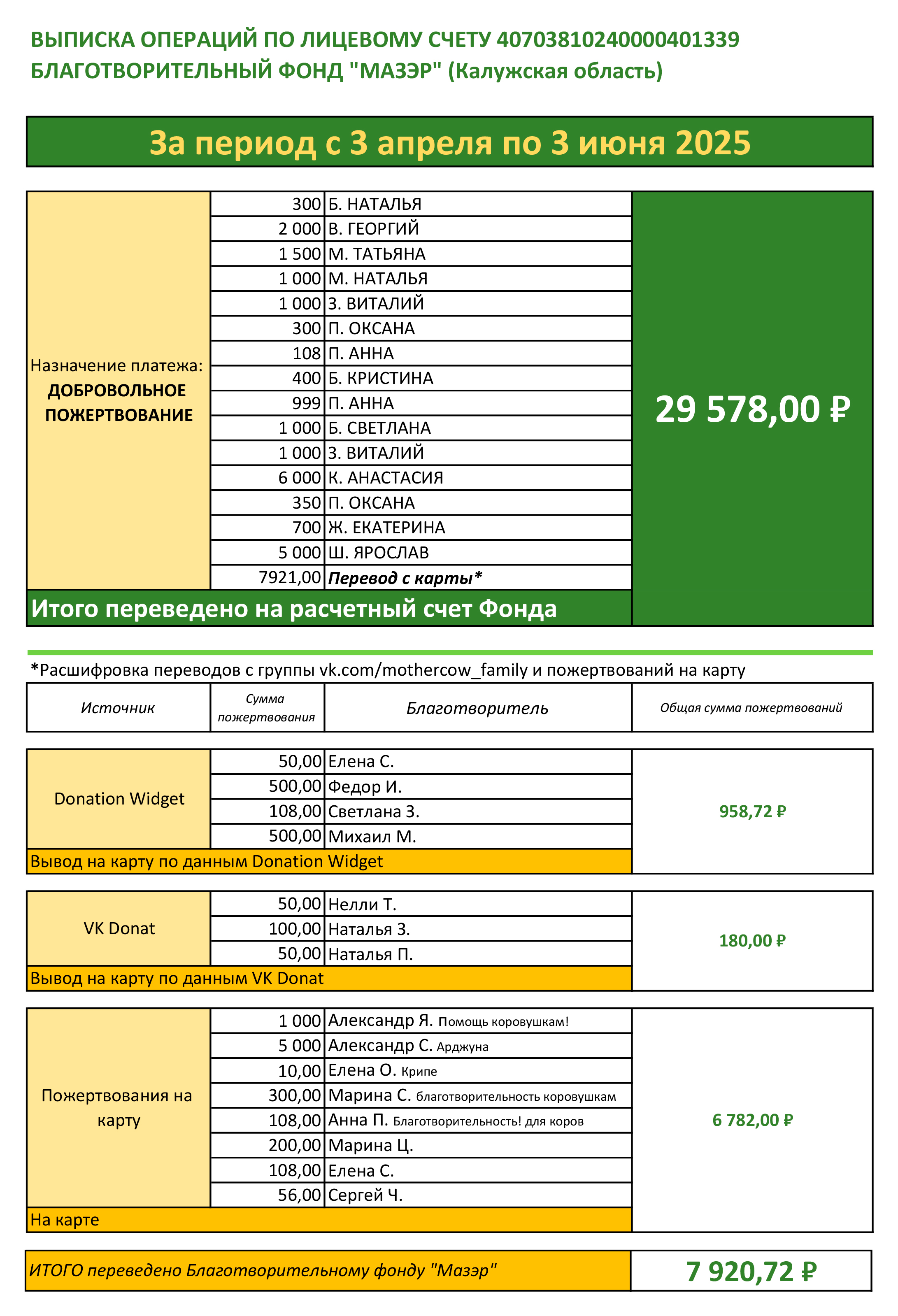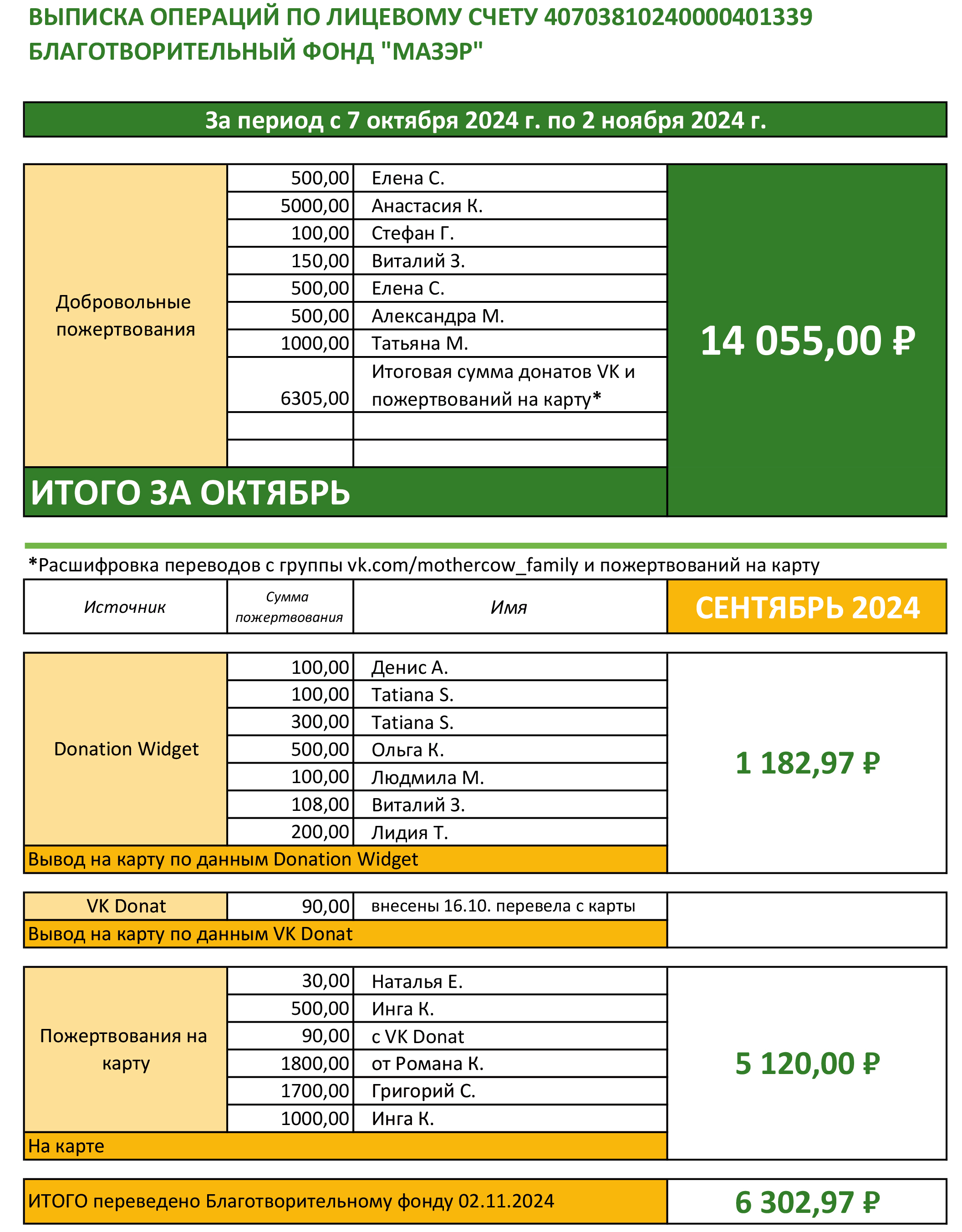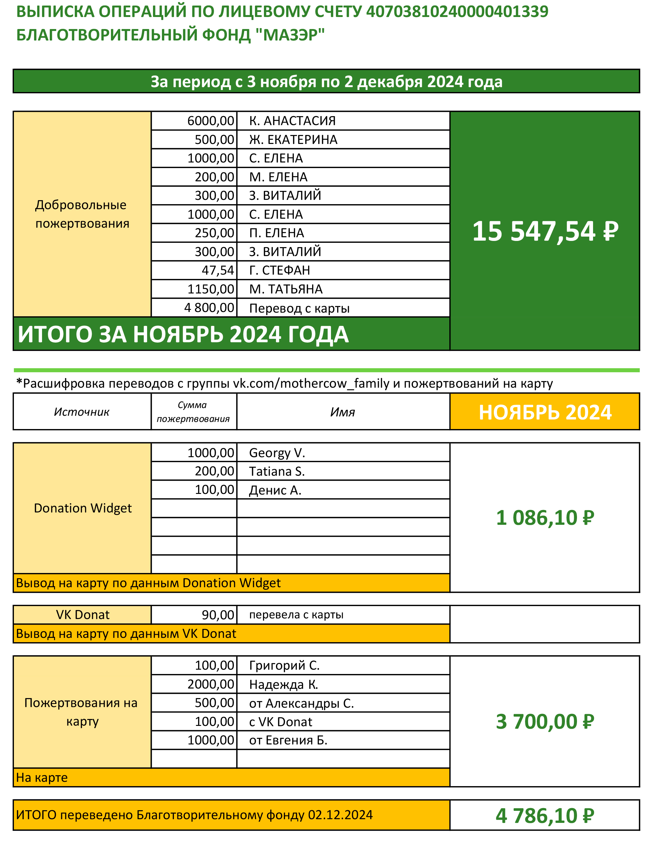 В начале каждого месяца бухгалтер Фонда будет присылать выписку со всеми поступлениями, а все пожертвования учитываются в