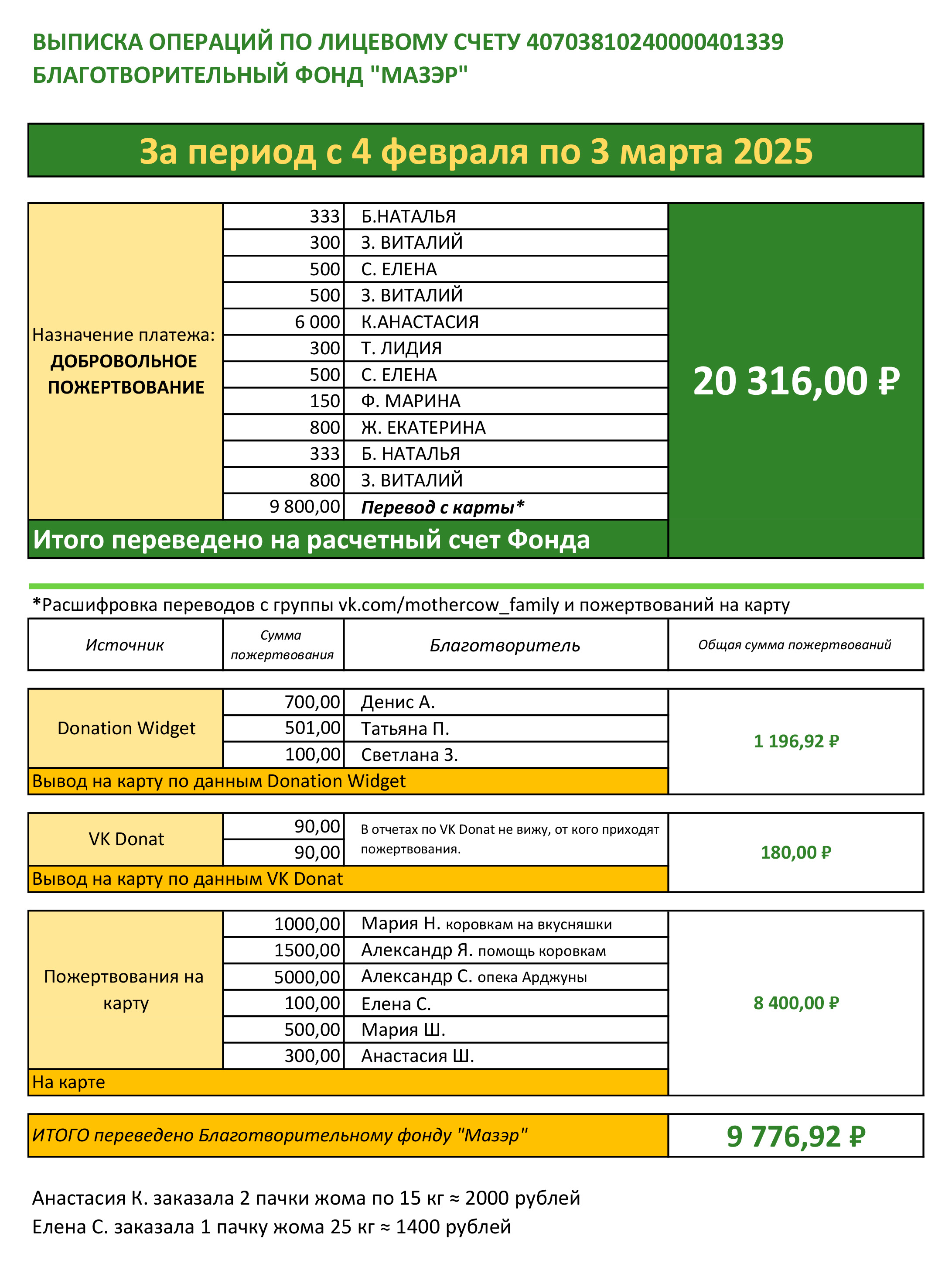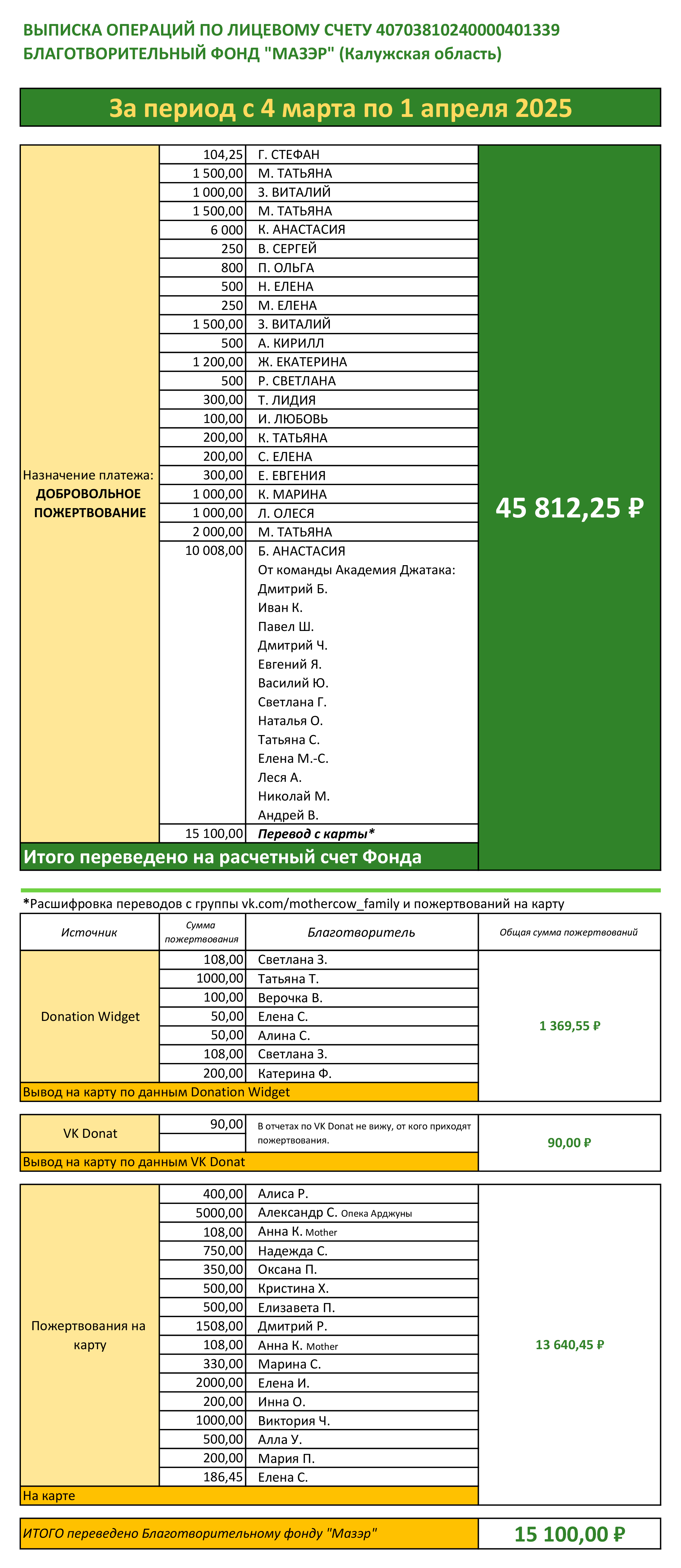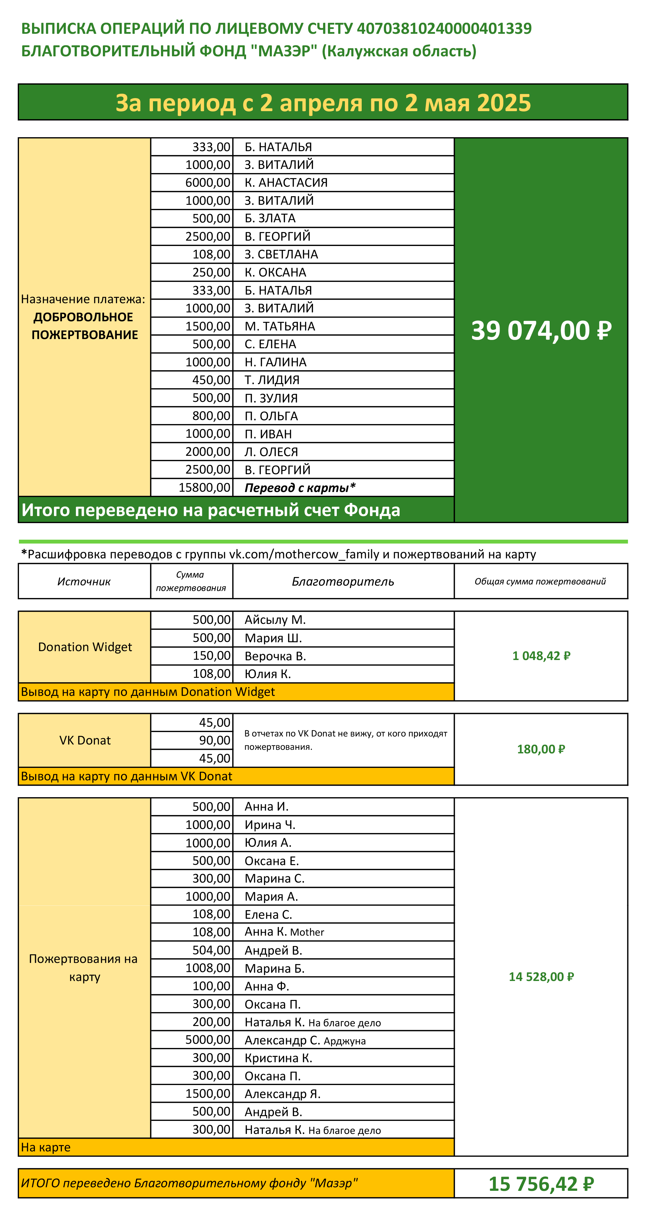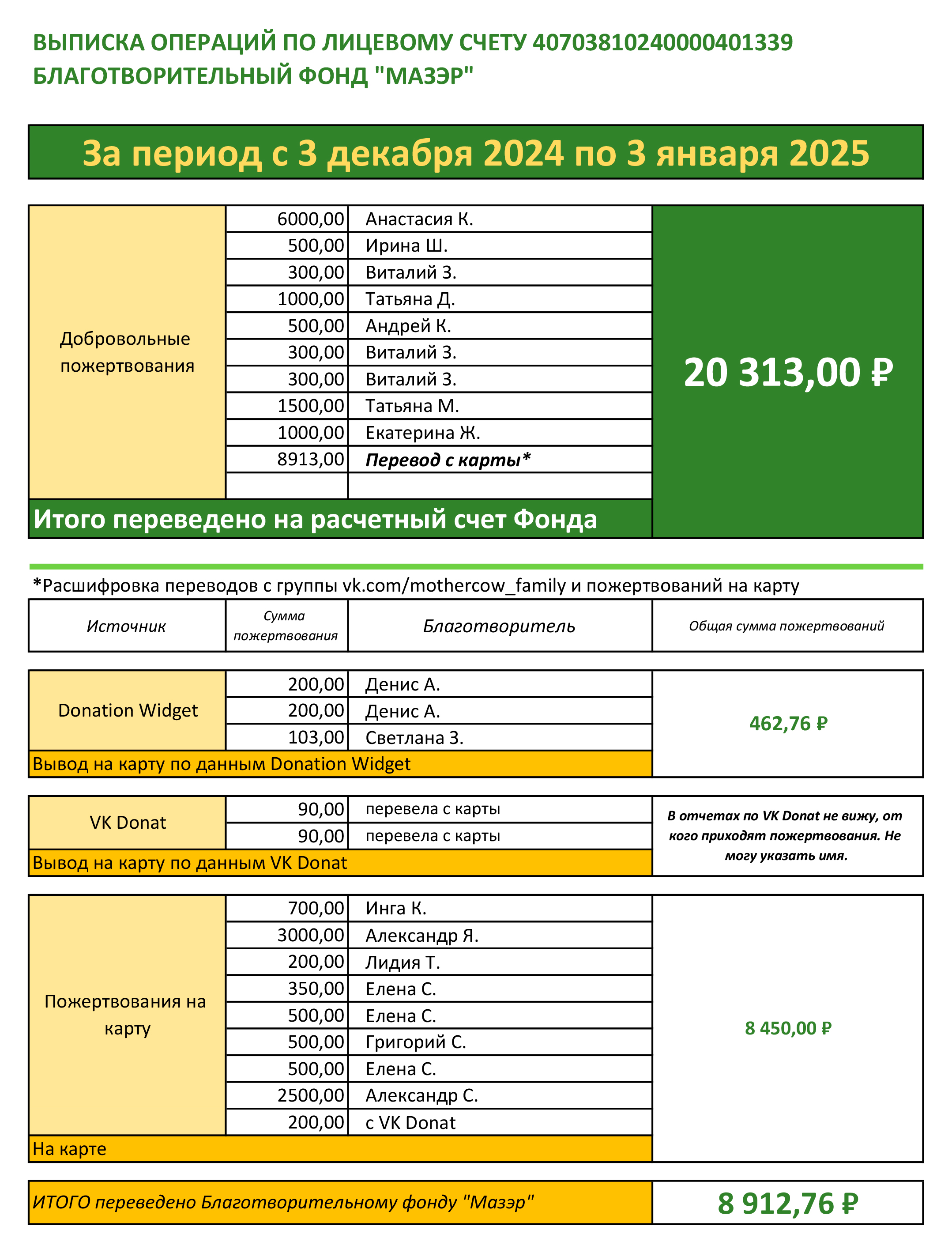 В начале каждого месяца бухгалтер Фонда будет присылать выписку со всеми поступлениями, а все пожертвования учитываются в